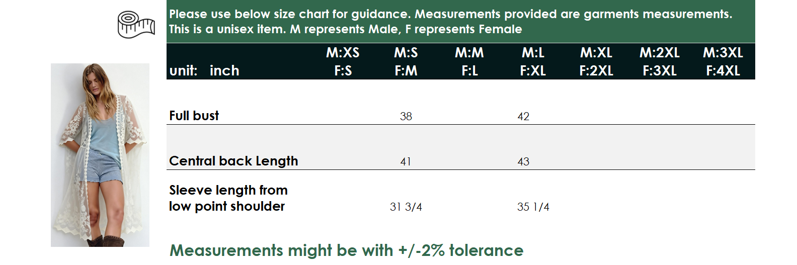 Diseñado con mangas tres cuartos de encaje y una cintura ligeramente definida, este estilo ofrece una silueta femenina que se puede combinar fácilmente con camisolas, vestidos y trajes de baño. El dobladillo festoneado en la parte inferior completa el look con un elegante acabado, lo que lo convierte en una prenda ideal para combinar con prendas de clima cálido y un estilo informal sofisticado.